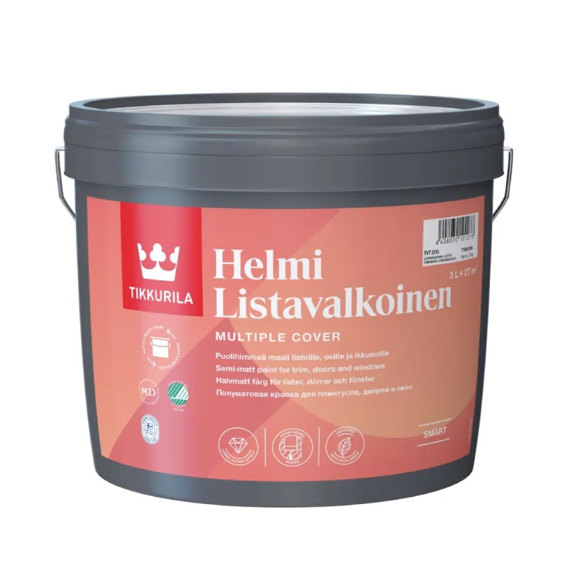 Semi-matt paint for trim, doors and windows provides long lasting effect that is both beautiful and durable. Helmi Listavalkoinen is perfect for painting trim, doors, window frames, cabinets etc.