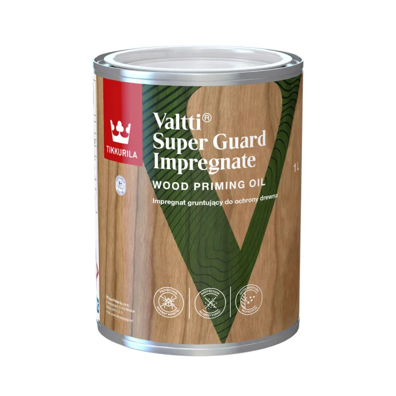 Valtti Super Guard Impregnate is a solventborne agent for exterior wood protection fungus Basidiomycota which decompose wood and blue stain fungus and insects technical wood vermin. Used for wood which doesn’t have contact with soil or surface water and ground water. Product can be used only for wood designed for use in 2nd and 3rd class of use which is for exterior use. Do not use for wood which have a direct contact with food or feed for animals or long contact with skin. Product recommended as a primer for following top coat products: Tikkurila Valtti Color Extra, Tikkurila Valtti Color New, Tikkurila Valtti Expert, Tikkurila Unica Super Lacquer, Tikkurila Everal Matt [10], Tikkurila Everal Semi Matt [30], Tikkurila Everal Semi Gloss [70], Tikkurila Everal High Gloss [90], Tikkurila Everal Aqua Semi Matt [40], Tikkurila Everal White Matt [10], Tikkurila Everal White Semi Matt [30], Tikkurila Everal White Semi Gloss [70].