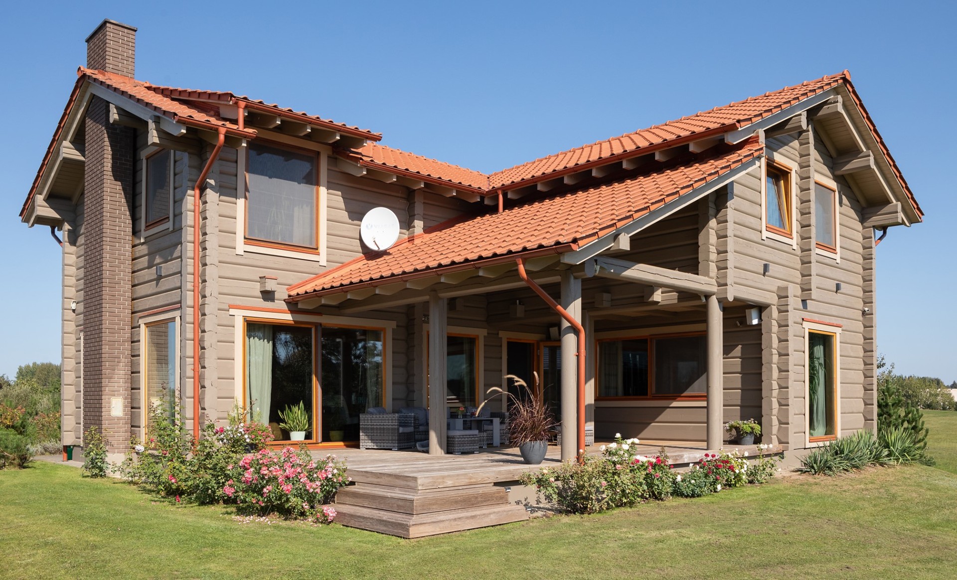 The surrounding environment inspired the choice of nature-friendly construction material: wooden logs. The façade was freshly renovated with semi-matt Tikkurila Vinha paint to enhance durability.