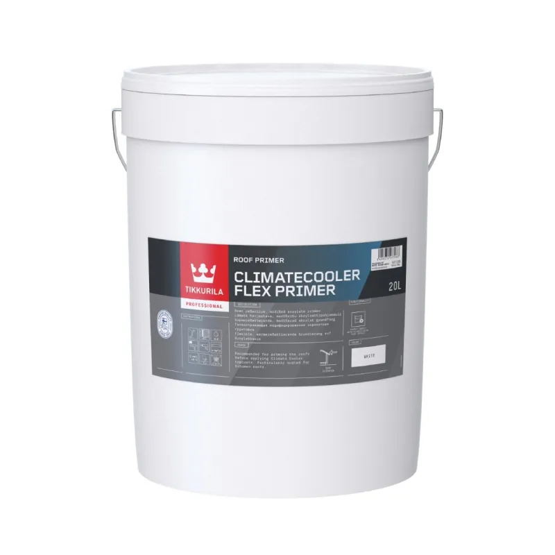 The flexible heat-reflecting primer is part of the ClimateCooler Flex system, which keeps the temperature of the roof surfaces lower in the sun. The unique ClimateCooler Flex Primer is to be used for priming roofs before coating with ClimateCooler Flex Topcoat.