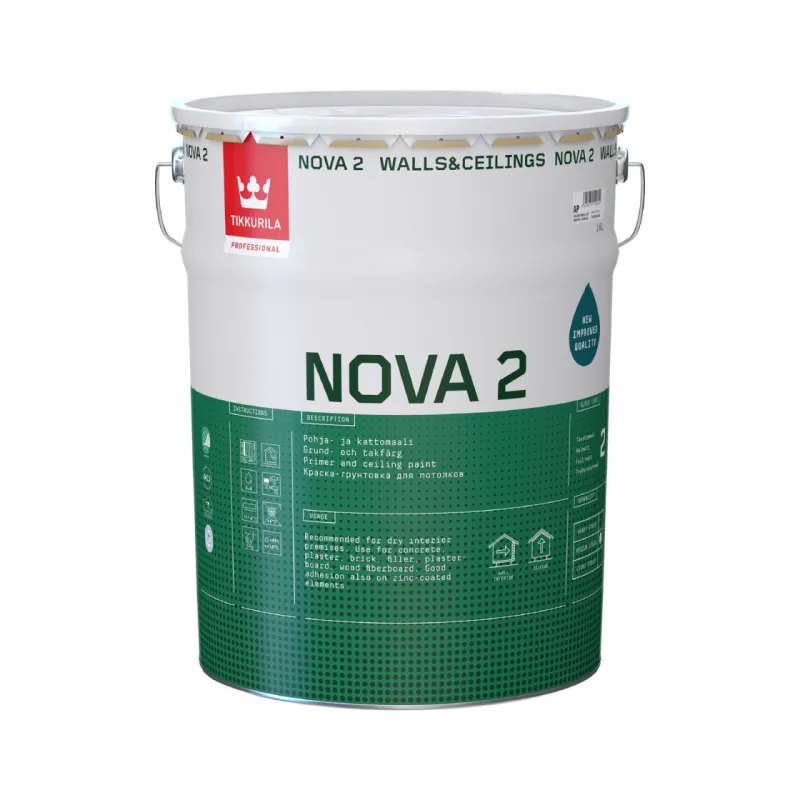 Use Nova 2 paint for wall and ceiling surfaces in dry interior spaces. The paint is suitable for painting concrete, plaster, filler, plasterboard, chipboard, and wood fibreboard surfaces. Nova 2 has also good adhesion on zinc-coated elements