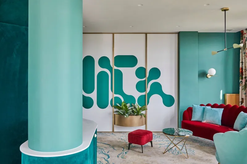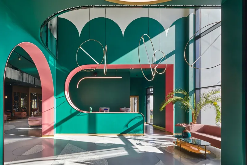 The hotel's interior is dominated by the colour emerald, which reflects the green of the surrounding pines. The bright, contrasting interior was created by interior architect Viktorija Puodžiūtė and her team. In the interior, the prevailing Art Deco lines of the early 20th century intertwine with motifs characteristic of the postmodern Memphis Group.